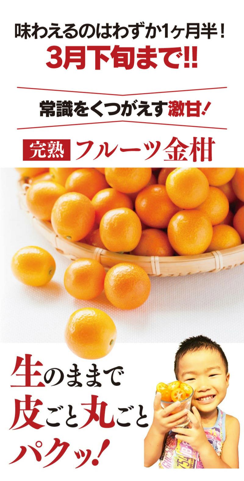 他の画像を見る 初めてのお客様限定 【初回限定】完熟フルーツ金柑 800g <同住所に2箱以上ご購入で 送料無料> <1月中旬より順次出荷> ※2箱で送料無料です。1配送先の数量が1箱の場合はご注文後、送料1,100円(沖縄および離島は2,000円)を追加いたします。 価格 ¥ 1,990 税込 詳細を見る お気に入りに登録する