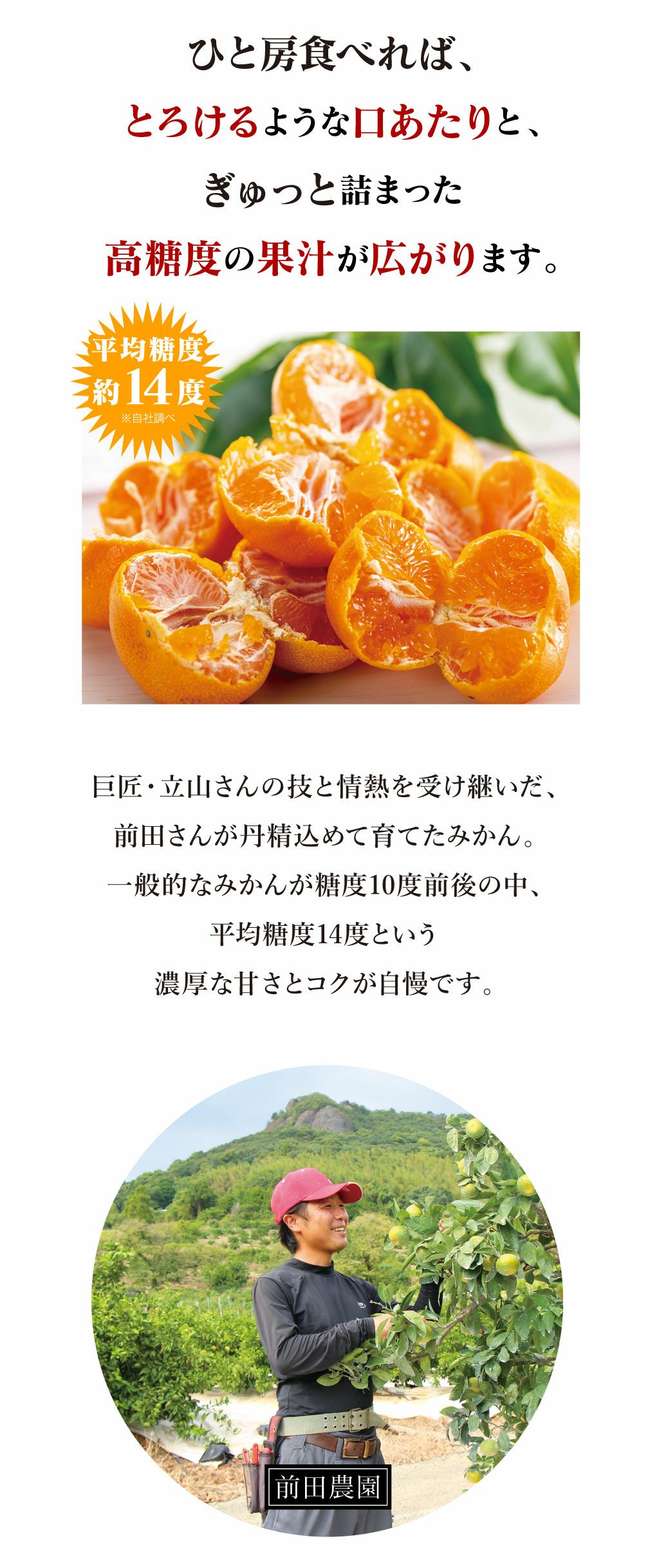 他の画像を見る 日本三大名匠といわれる立山さんから引き継ぎ極甘のみかんをつくる前田農園さんより直送 小玉 伝承とろこくみかん 3kg(2Sサイズ50-60玉前後)前田農園さんの特選ミカン <10月下旬より順次出荷> 送料無料 プレミアム 温州みかん ギフト プレゼント 大嶌屋(おおしまや) 価格 ¥ 4,600 税込 詳細を見る お気に入りに登録する