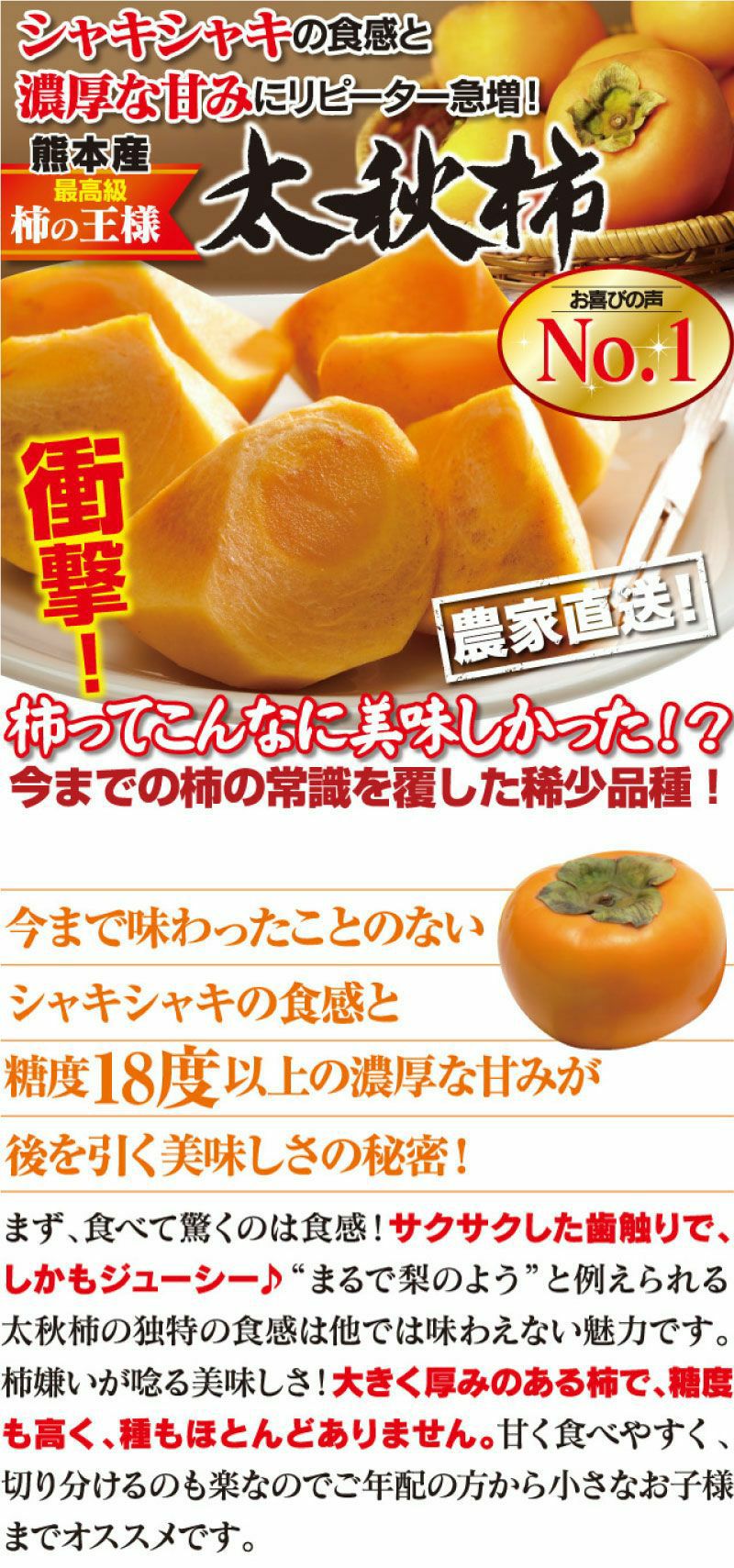 他の画像を見る まるで梨のようにシャキシャキの食感!柿の王様 贈答用 太秋柿 2kg (4~6玉) ギフト 送料無料 農家直送 熊本産 たいしゅうがき 甘柿 甘い<10月下旬より順次出荷> 果物 フルーツ おおしま屋【0409870】 定価 ¥ 5,900 のところ 価格 ¥ 5,500 税込 在庫切れ 詳細を見る お気に入りに登録する