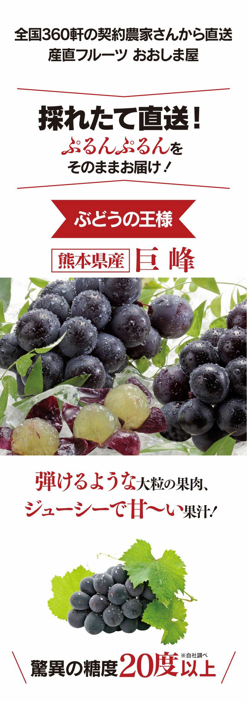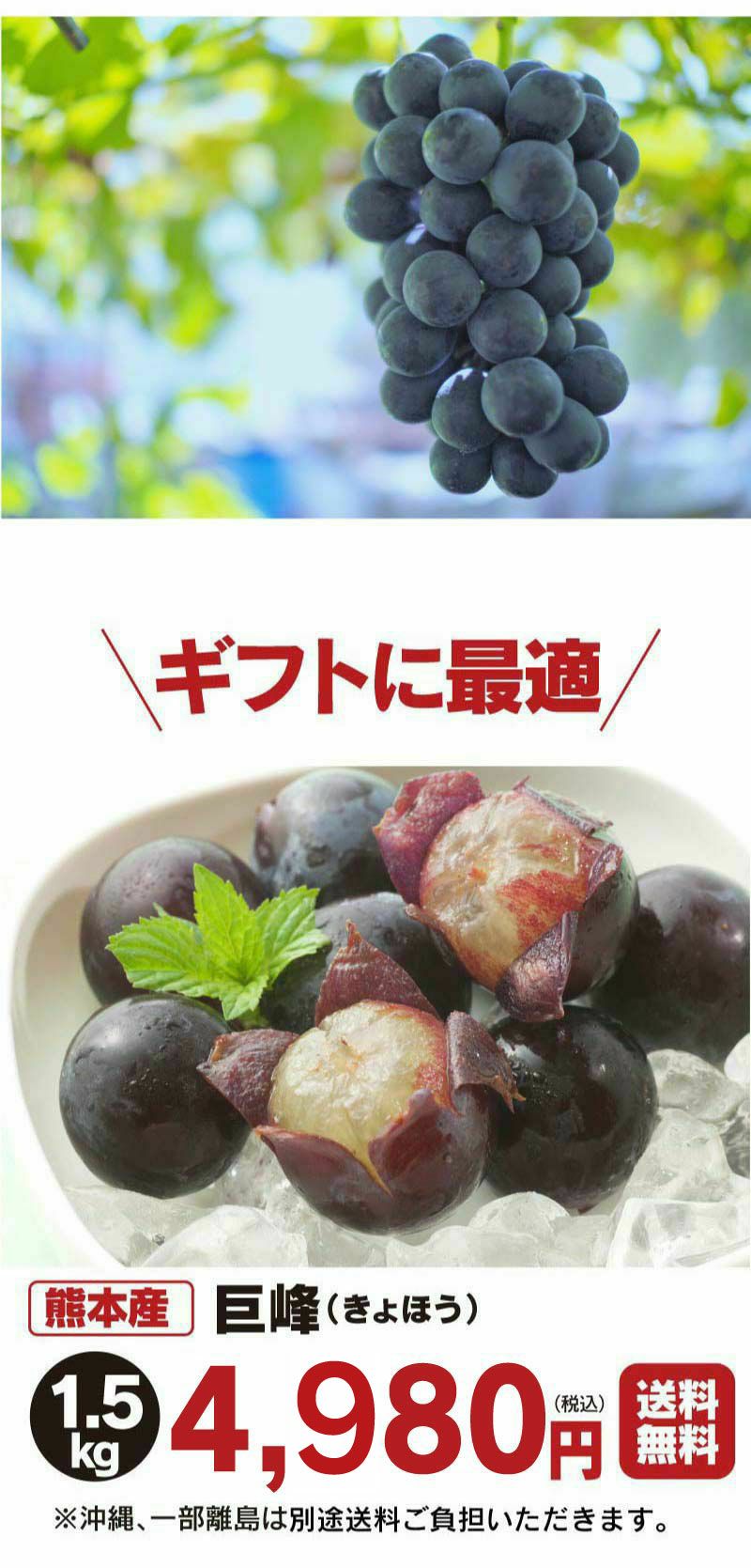 他の画像を見る 朝採れの新鮮な巨峰を農家直送! 巨峰 1.5kg(3-5房) ぶどう 送料無料 熊本産 農家直送・冷蔵便(クール代別途) <7月上旬より出荷予定> 大嶌屋(おおしま屋) クール代別途 価格 ¥ 4,980 税込 在庫切れ 詳細を見る お気に入りに登録する