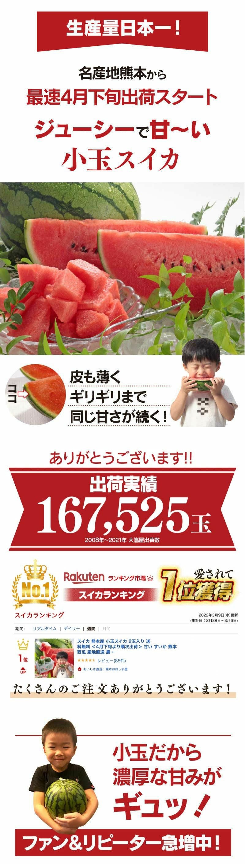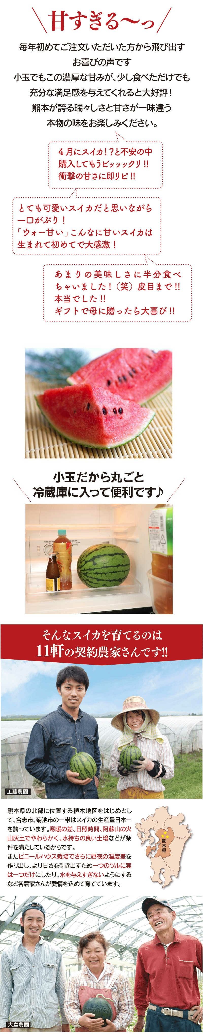 他の画像を見る 生産量日本一 名産地熊本からどこよりも早くあま~いスイカをお届け 熊本県産 小玉スイカ 1玉入り 送料無料 <5月上旬より順次出荷予定> 小玉すいか すいか スイカ 農家直送 産地直送 果物 フルーツ 大嶌屋(おおしまや)【0451459】 定価 ¥ 4,980 のところ 価格 ¥ 4,500 税込 在庫切れ 詳細を見る お気に入りに登録する