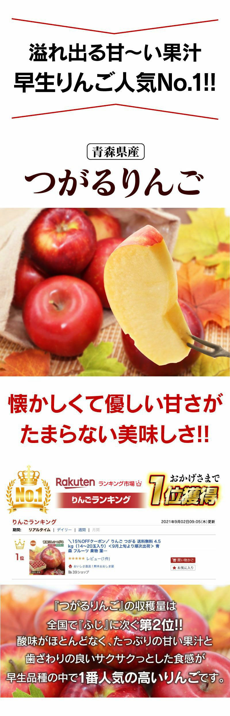 他の画像を見る 早生りんごの中で人気NO1! りんご つがる 送料無料 4.5kg(14-20玉入り)<9月上旬より順次出荷> クール代別途 青森 フルーツ 果物 葉取らず栽培 農家直送 産地直送 大嶌屋(おおしまや) 価格 ¥ 5,500 税込 クール便でお届け 在庫切れ 詳細を見る お気に入りに登録する