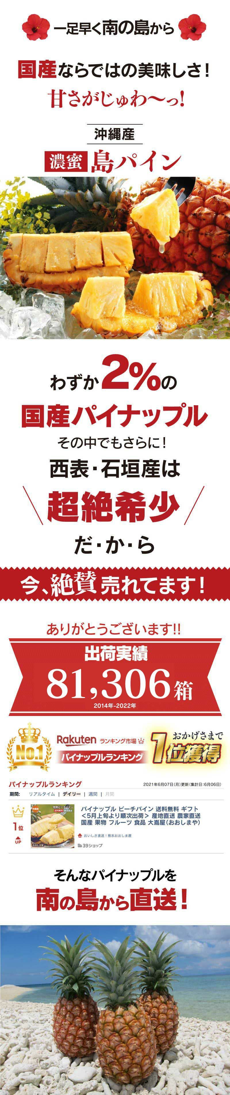 他の画像を見る 国産パイナップル ピーチパイン(ミルクパイン ソフトタッチ)を農家直送でお届け!! 沖縄 パイナップル ピーチパイン 2.5kg <5月上旬より順次出荷> 約2玉~6玉入り 送料無料 クール便 農家直送 フルーツ 果物 大嶌屋(おおしまや) 定価 ¥ 5,980 のところ 価格 ¥ 5,500 税込 在庫切れ 詳細を見る お気に入りに登録する