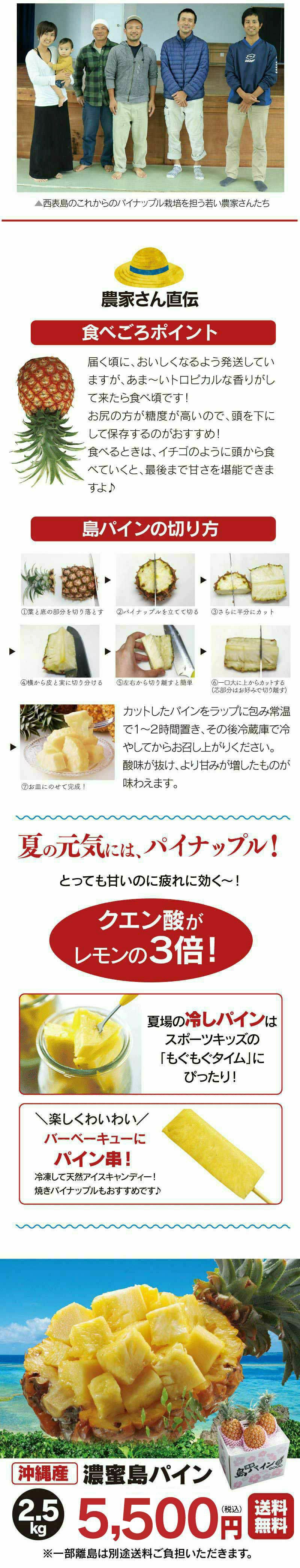 他の画像を見る 国産パイナップルをお届け! 沖縄 パイナップル 島パイン 2.5kg 送料無料 約2玉~6玉入り 農家直送 <5月上旬より順次出荷> 品種おまかせ フルーツ 果物 大嶌屋(おおしまや) 定価 ¥ 5,980 のところ 価格 ¥ 5,500 税込 在庫切れ 詳細を見る お気に入りに登録する
