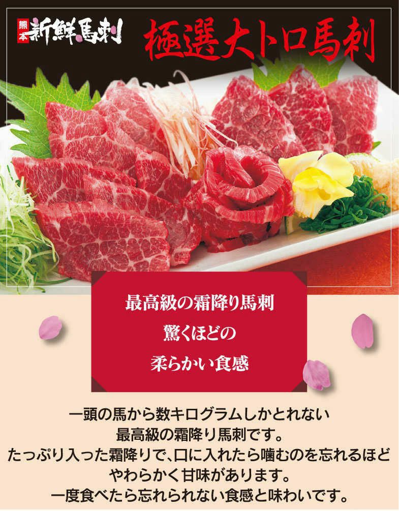 他の画像を見る 最高級霜降り馬刺 驚く程やわらかい食感です。 極選大トロ馬刺(一人前) <送料別・冷凍便・クール代別> 【0307990】 クール代別途 価格 ¥ 2,200 税込 カートに入れる お気に入りに登録する