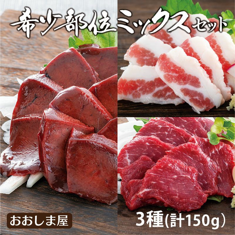同梱におすすめ!馬刺し通もうなる希少部位 馬刺し 希少部位ミックスセット 3人前分 送料別 150g 馬レバー刺し 馬ヒレ刺し ふたえご馬刺し フタエゴ 熊本 名物 刺身 馬刺 馬肉 おつまみ 馬刺しセット グルメ 食品 <おおしま屋発送の冷凍便と同梱可能・送料別・クール代別> 大嶌屋(おおしまや) 【0308524】