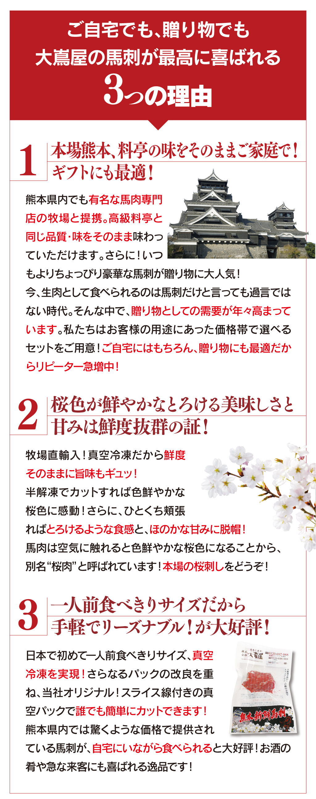きれいな桜肉の中に程良く入った霜がたまらない美味しさ 霜降り馬刺し(一人前) <送料別・冷凍便・クール代別> 【0307980】