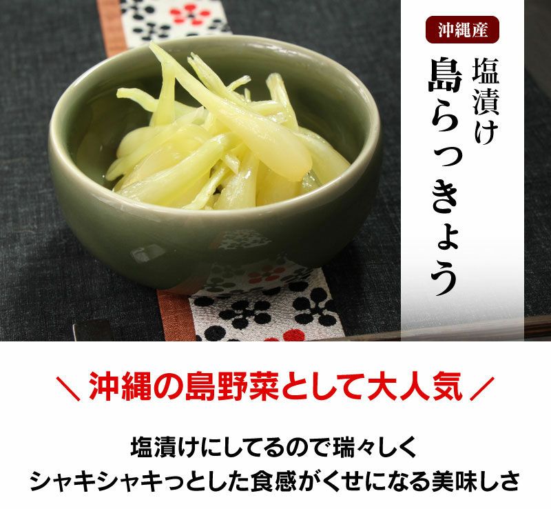他の画像を見る 大人気!沖縄島野菜!やみつきになるシャキシャキ食感 島らっきょう 塩漬け 1袋×40g 沖縄産 島野菜 沖縄特産 <送料別・クール代別・冷凍便と同梱可> 大嶌屋(おおしまや) 価格 ¥ 390 税込 クール代別途 クール便でお届け カートに入れる お気に入りに登録する