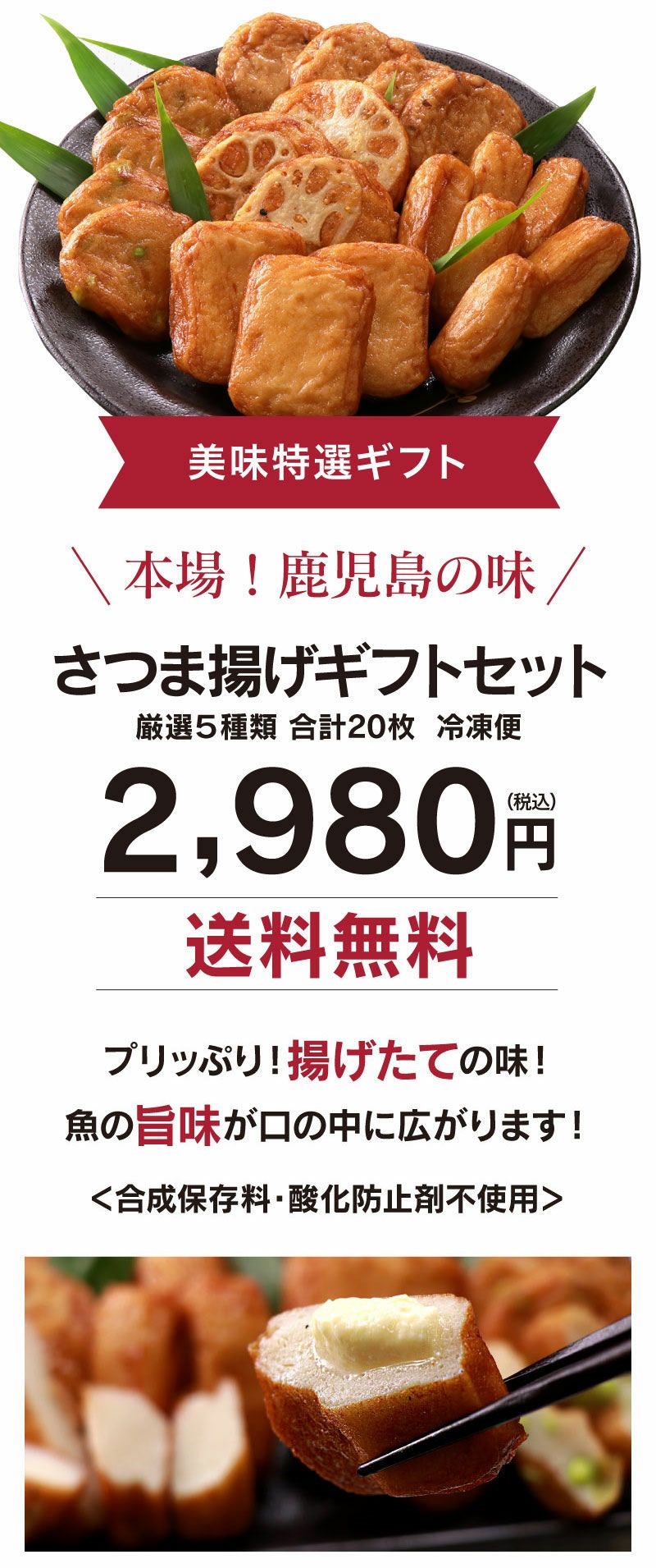他の画像を見る 本場鹿児島のさつまあげ!ぷりっ!とした食感! 保存料・酸化防止剤の添加物不使用 さつま揚げ ギフトセット 送料無料・クール代込 5種類 20枚 さつまあげ 鹿児島 名物 土産 おつまみ おでん 食品 グルメ プレゼント <おおしま屋発送の冷凍便と同梱可能>大嶌屋(おおしまや) 価格 ¥ 2,980 税込 クール代込 カートに入れる お気に入りに登録する
