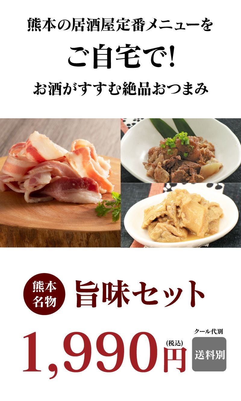 他の画像を見る お酒がすすむ絶品おつまみ 旨味セット <送料別 ・クール別> 冷凍便 馬肉 食べ比べ グルメ 大嶌屋(おおしまや) 価格 ¥ 1,990 税込 クール便でお届け 在庫切れ 詳細を見る お気に入りに登録する