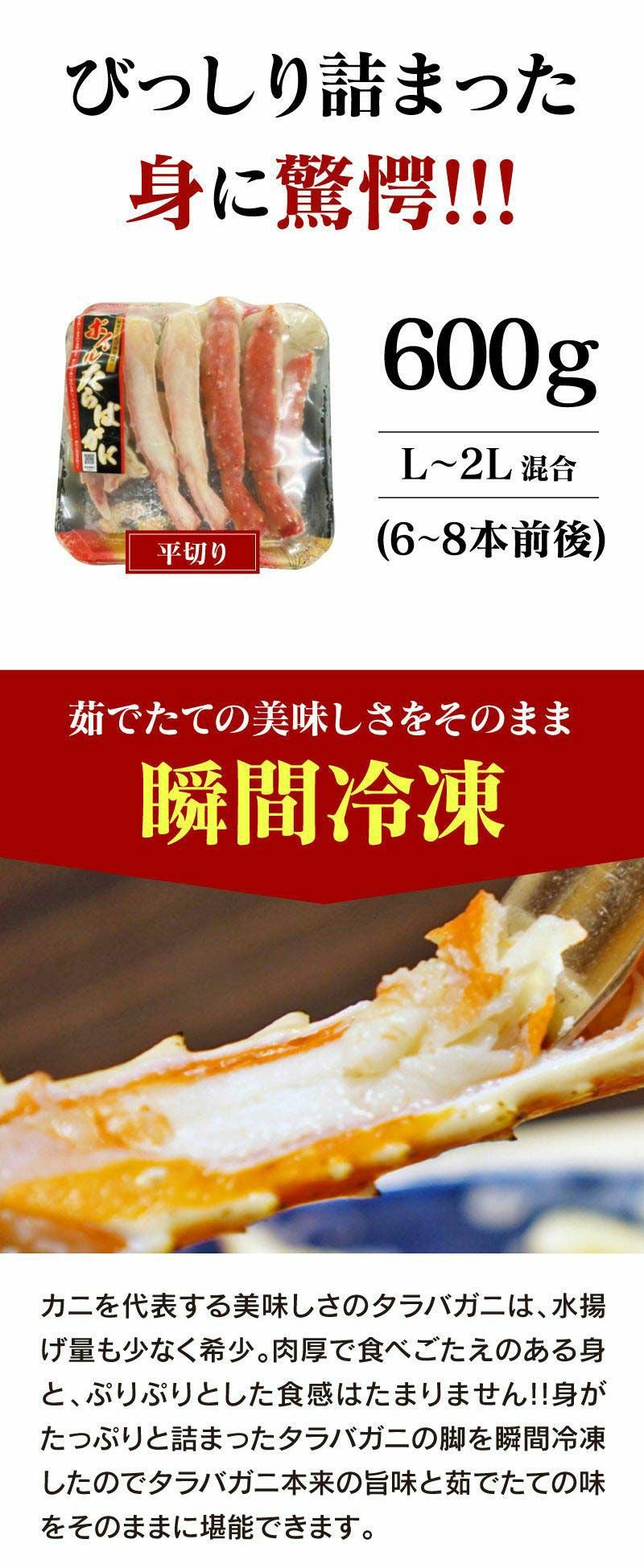 他の画像を見る ボイルたらばがに 茹でたて瞬間冷凍 送料無料 タラバガニ 茹でタラバガニ (平切り) L-2L混合(600g/6-8本前後) <送料無料 クール代別・おおしま屋発送 冷凍便(同梱可)> かに 蟹 カニ ボイル たらばがに ロシア産 おおしま屋 価格 ¥ 12,800 税込 クール代別途 クール便でお届け 在庫切れ 詳細を見る お気に入りに登録する