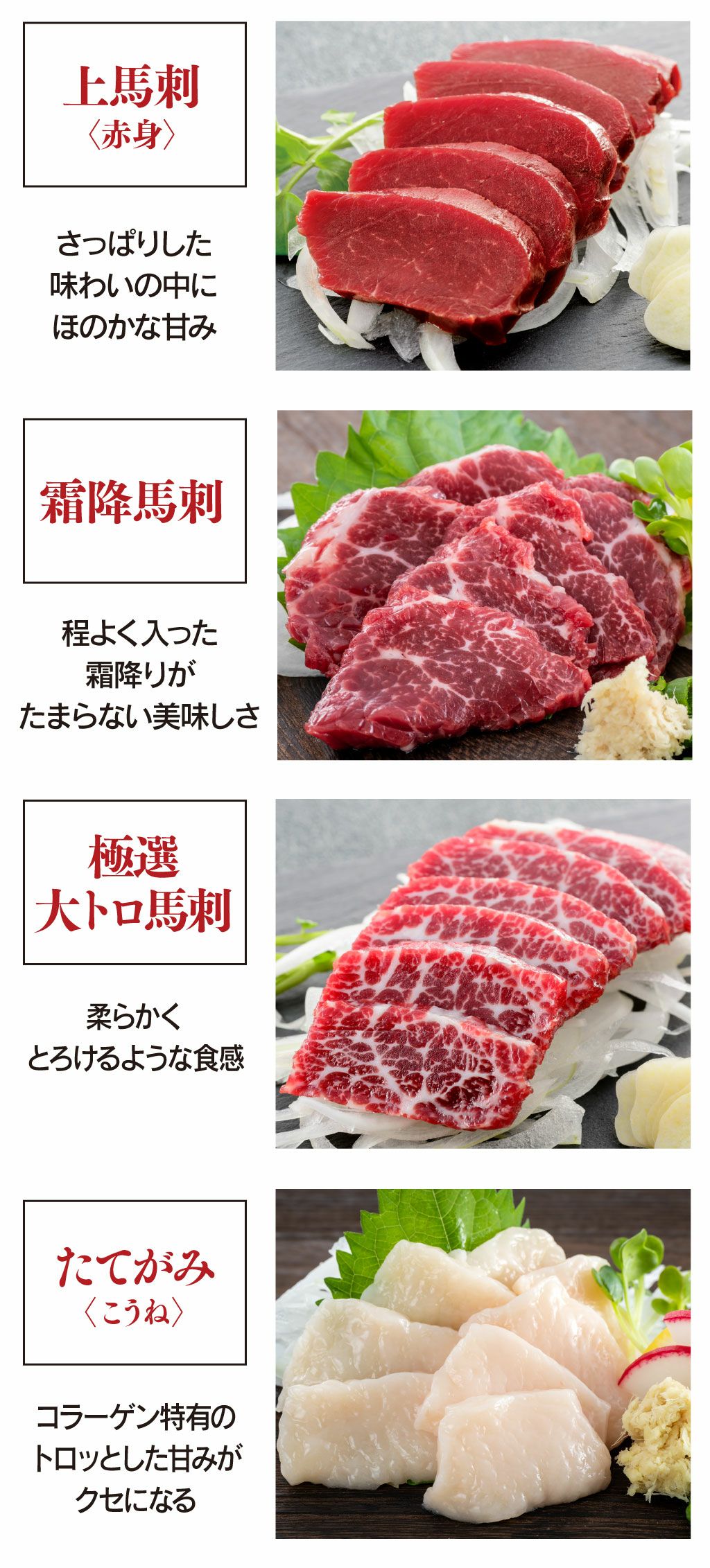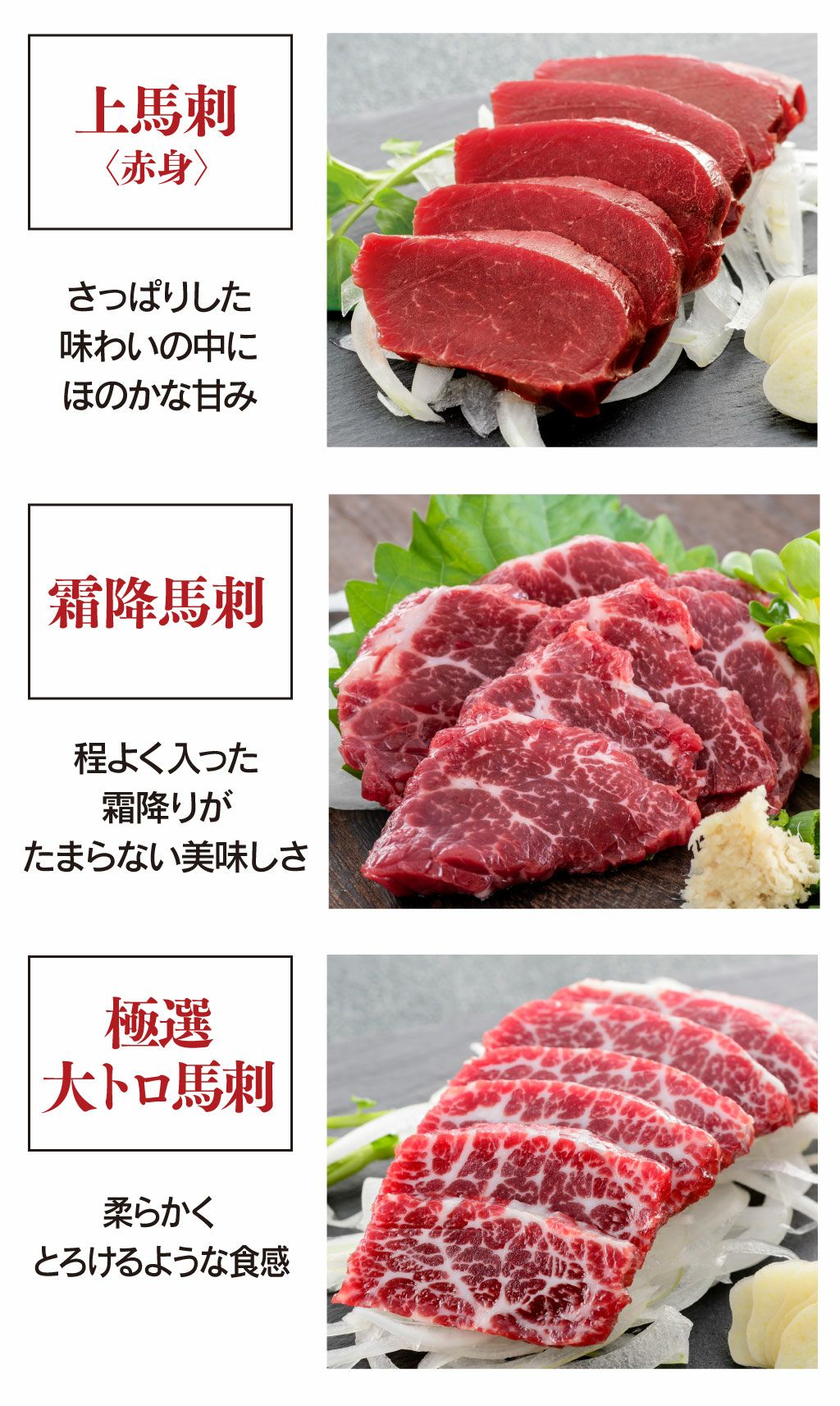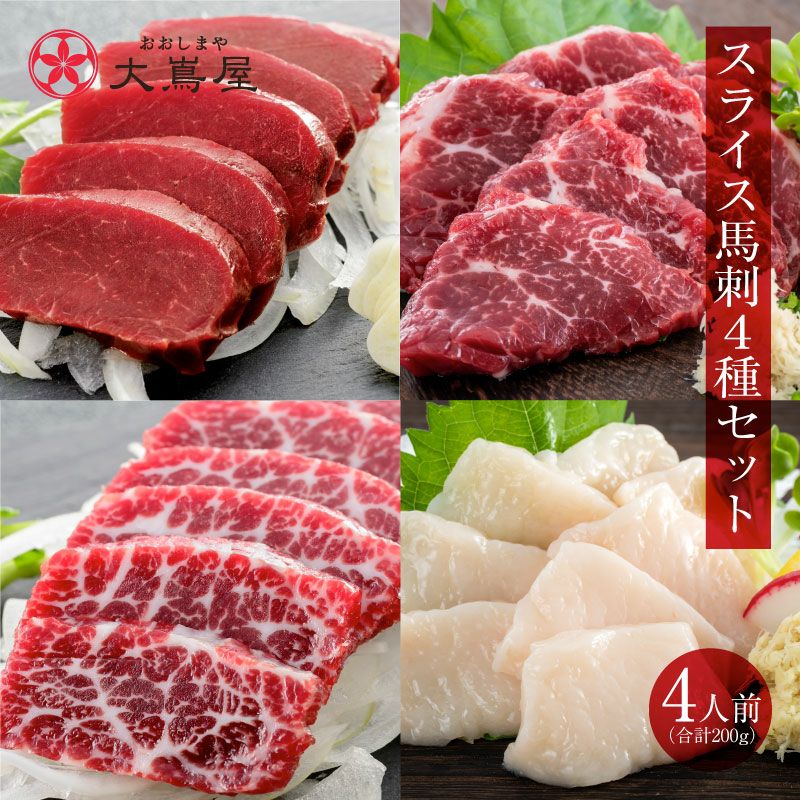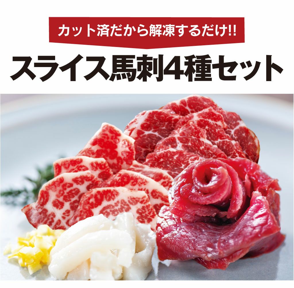 他の画像を見る たしかな旨味の赤身、程よい霜降り、とろける美味しさの大トロ、コラーゲンたっぷりたてがみ! 馬刺しの王道を思う存分味わえる! 熊本新鮮馬刺 スライス馬刺4種セット 4人前合計200g<送料無料・冷凍便・クール代別途> 馬刺し 大嶌屋(おおしまや) 【0308426】 価格 ¥ 6,900 税込 クール代別途 クール便でお届け 在庫切れ 詳細を見る お気に入りに登録する