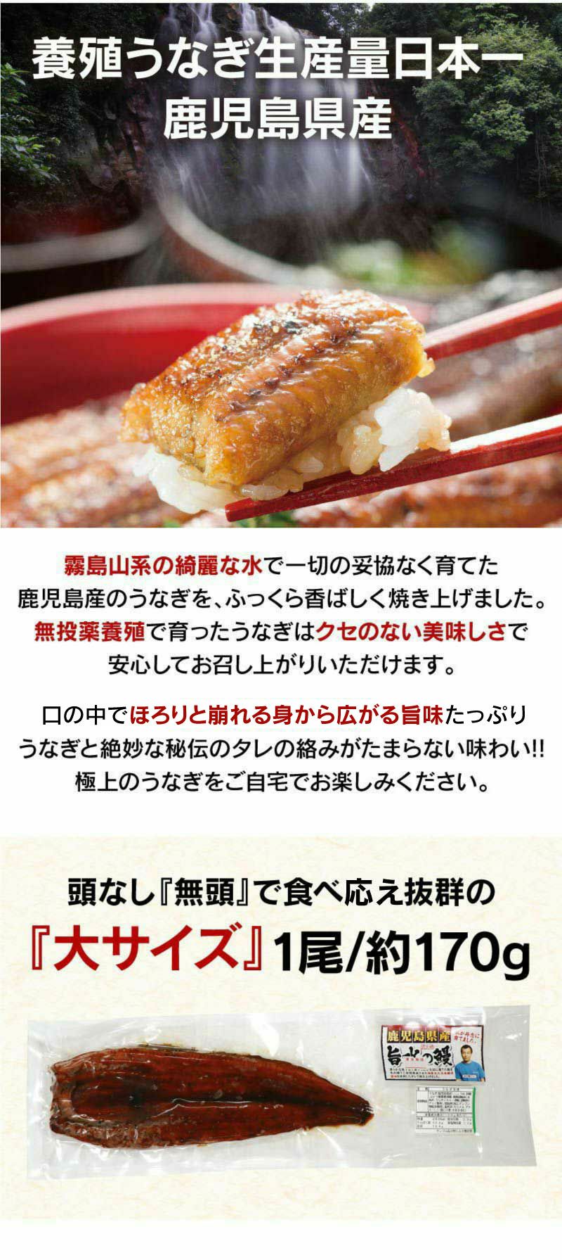 他の画像を見る 鹿児島のおいしい水で育てられた安心安全の国産ウナギは脂が乗ってふんわりやわらか! 国産 うなぎ蒲焼き 大サイズ2尾(170g×2)セット(タレ付き) <送料無料・冷凍便・クール代別> 鰻 ウナギ 鹿児島産 食品 グルメ ギフト プレセント 大嶌屋(おおしまや) クール代別途 価格 ¥ 7,600 税込 カートに入れる お気に入りに登録する
