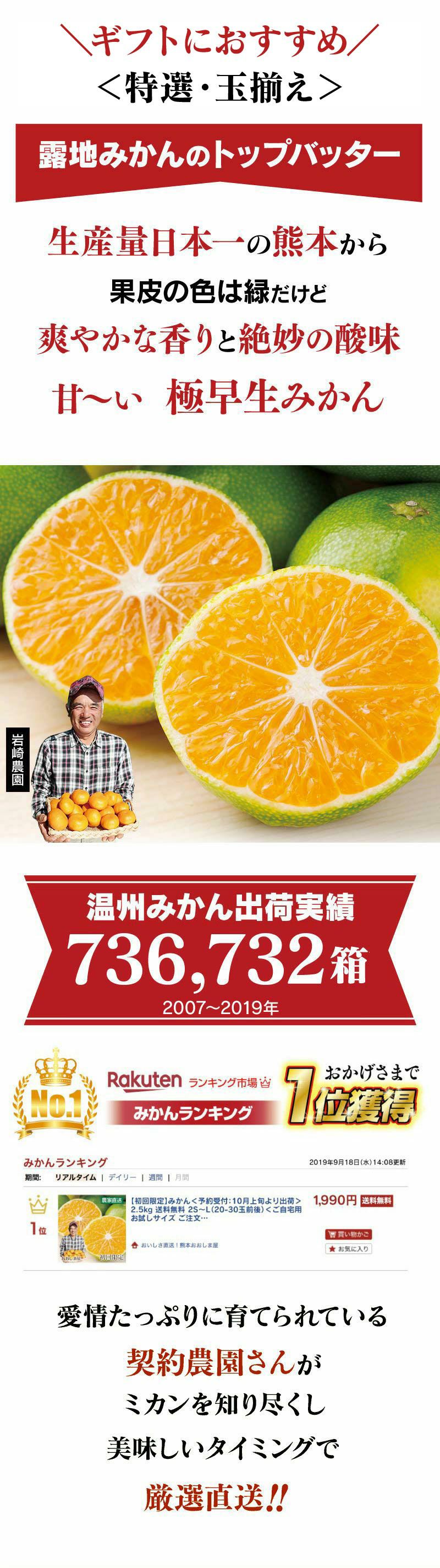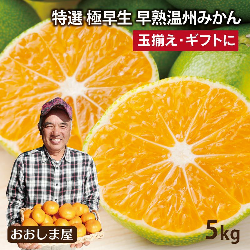 他の画像を見る ギフトやご進物、プレゼントにどうぞ! 特選 早熟温州みかん 5kg 【10月上旬より順次出荷】 送料無料 極早生 玉揃え ご進物 ギフト 大嶌屋(おおしまや) 価格 ¥ 5,300 税込 在庫切れ 詳細を見る お気に入りに登録する