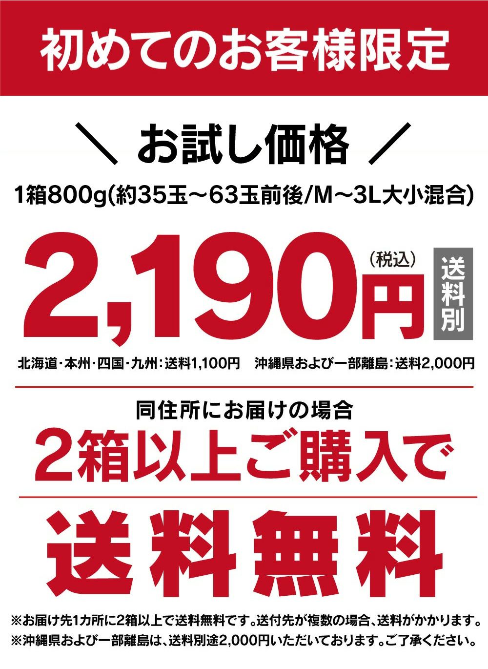 他の画像を見る 初めてのお客様限定 【初回限定】完熟フルーツ金柑 800g <同住所に2箱以上ご購入で 送料無料> <1月中旬より順次出荷> ※2箱で送料無料です。1配送先の数量が1箱の場合はご注文後、送料1,100円(沖縄および離島は2,000円)を追加いたします。 価格 ¥ 1,990 税込 詳細を見る お気に入りに登録する