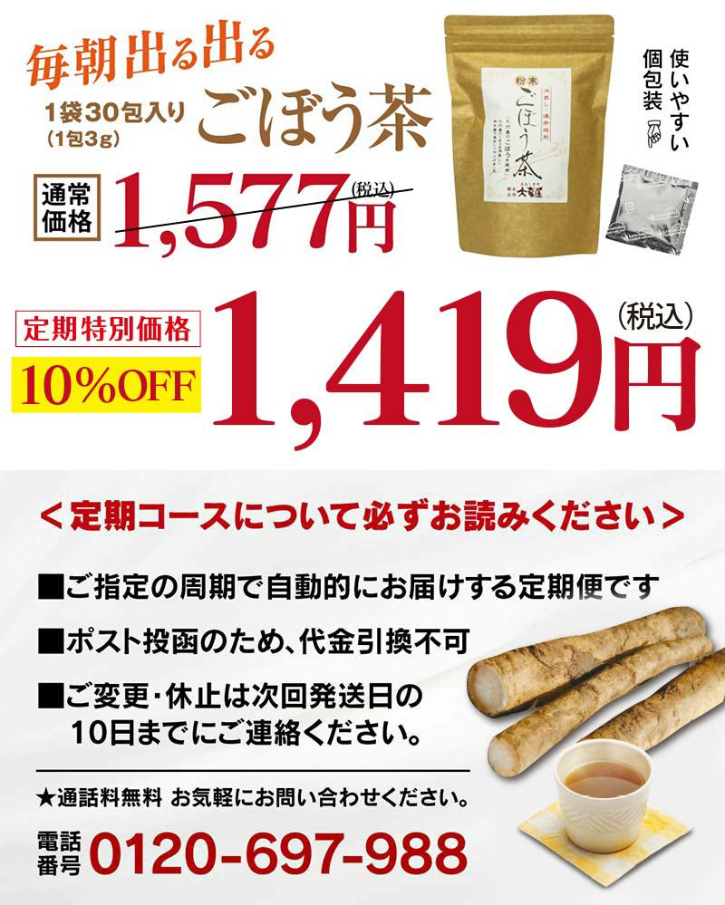 他の画像を見る 食物繊維を丸ごと摂取!粉末ごぼう茶 【定期便】 粉末 ごぼう茶 1袋 90g(3g×30包) <ポスト投函 送料別> 1ヶ月に1回お届け 小包装 丸ごと粉末 国産ゴボウ使用 健康 食品 大嶌屋(おおしまや) 価格 ¥ 1,419 税込 定期販売 詳細を見る お気に入りに登録する