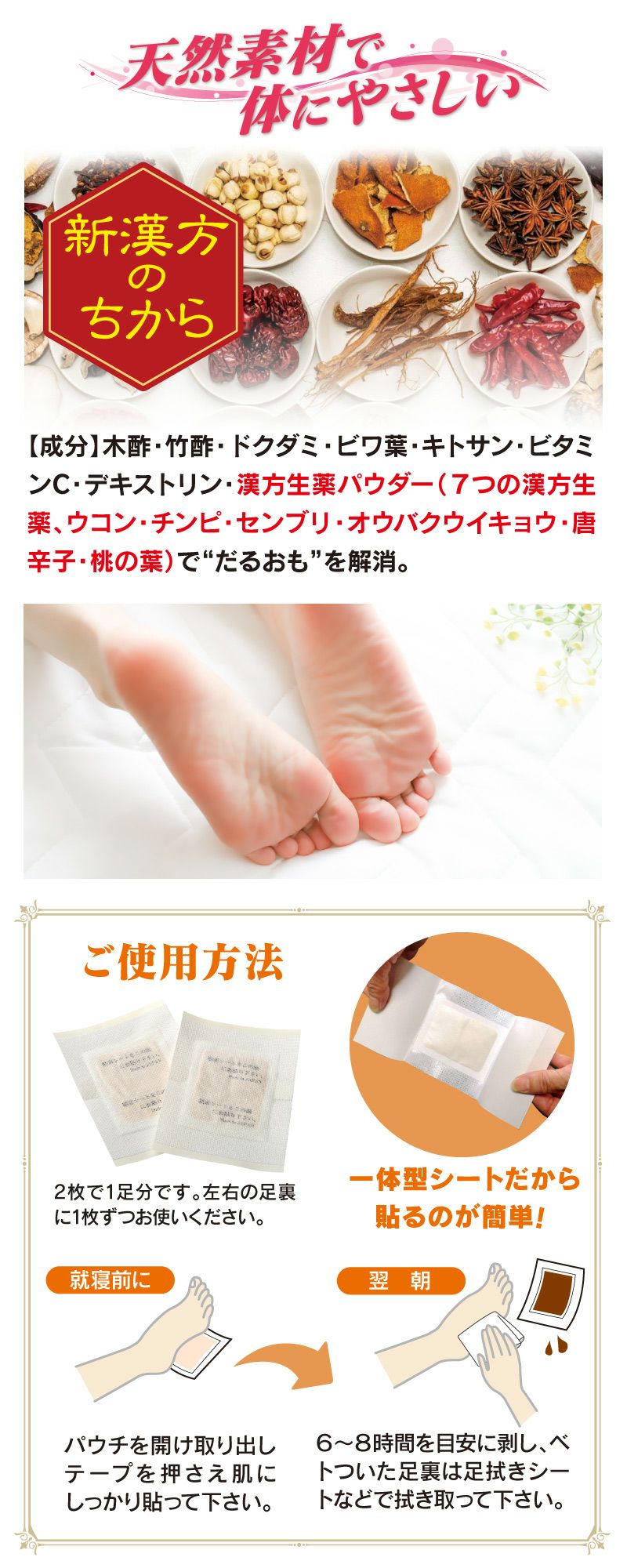 他の画像を見る おやすみ前の足にご褒美!貼って寝るだけで疲れた足が嘘みたい!! 足湯気分 新漢方の力 ほっとりずむ 1箱(10枚入り5足分 ※足ふきシート入り) 送料別 同住所に3箱以上で送料無料 足裏シート 価格 ¥ 1,980 税込 詳細を見る お気に入りに登録する