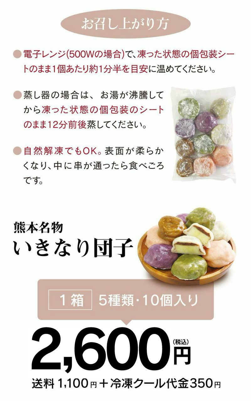 他の画像を見る しっとり、もっちり。さつまいもを使った素朴なご当地スイーツ。 熊本名物 いきなり団子 5種食べ比べセット 合計10個入り <送料別・冷凍便・クール代別> さつま芋スイーツ 九州産さつまいも 国産あずき 菓子 お土産 和菓子【0900590】 価格 ¥ 2,600 税込 クール代別途 クール便でお届け カートに入れる お気に入りに登録する