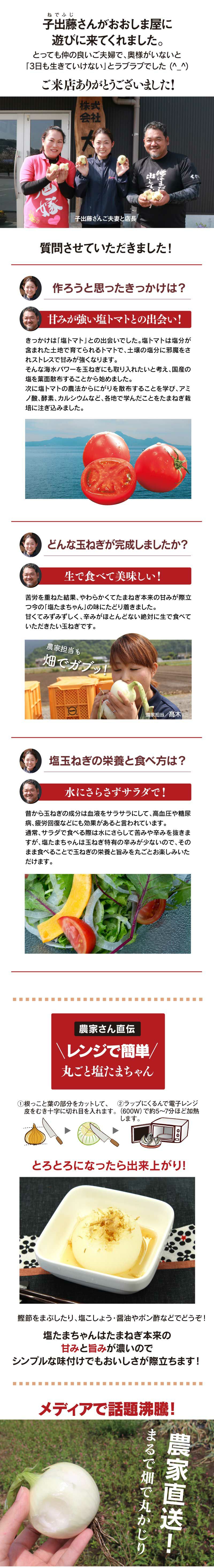 他の画像を見る テレビで紹介され大反響 日本一甘くみずみずしい塩玉ねぎを畑から直送 塩たまちゃん 2.5kg 送料別 熊本産 子出藤農園の塩たまねぎ 4月上旬より順次出荷 <農家直送・同梱不可>新たまねぎ 新玉ねぎ タマネギ 玉葱 価格 ¥ 2,500 税込 在庫切れ 詳細を見る お気に入りに登録する