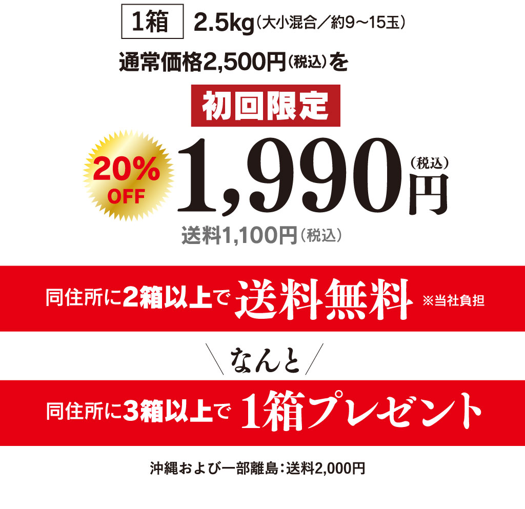 | ■内容量 | ●2.5kg(約9~15玉前後) ●サイズ:サイズ混合 運送中の傷みを考慮し、少し多めに入れております。 |
