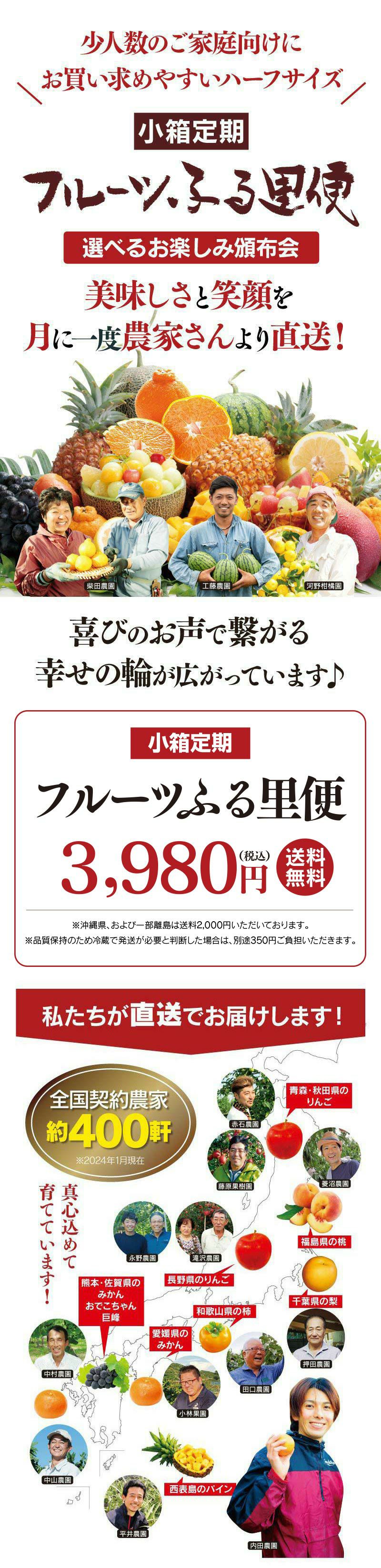 他の画像を見る 少人数向けのハーフサイズ フルーツふる里便 <小箱> 【定期便】 送料無料 果物 定期コース 頒布会 農家直送 同梱不可 大嶌屋(おおしまや) 価格 ¥ 3,980 税込 産地直送 定期販売 詳細を見る お気に入りに登録する