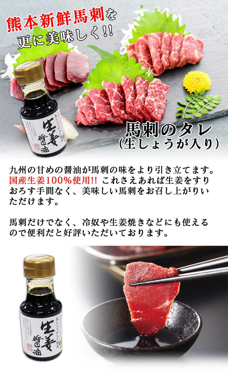 他の画像を見る しょうがの風味が爽やかに香り立つ、旨味をさらに引き出すお醤油です。 馬刺のタレ 生姜醤油 生しょうが入り 1本150ml(約15人前分)<送料別・冷凍便・クール代別> 馬刺し専用たれ【0307530】 価格 ¥ 350 税込 カートに入れる お気に入りに登録する