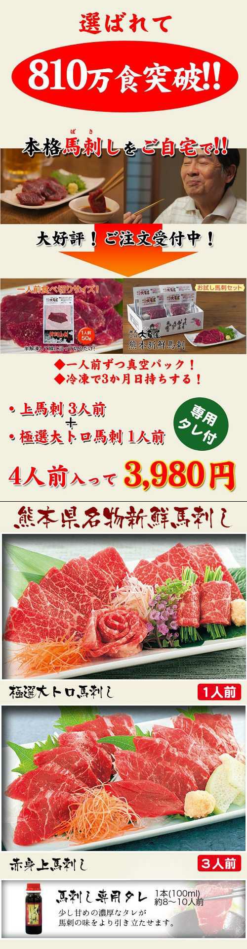 他の画像を見る 本場熊本の新鮮馬刺の赤身から大トロまで堪能できます! 珠玉の馬刺セット (2回目以降のお客さま)<送料別・冷凍便・クール代別> 熊本新鮮馬刺 大嶌屋(おおしまや)【0308311】 クール代別途 価格 ¥ 3,980 税込 カートに入れる お気に入りに登録する