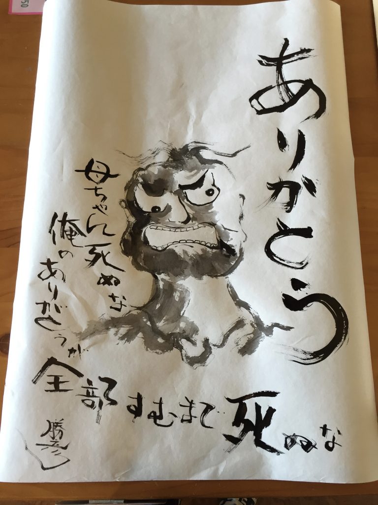 農作業中に両手をトラクターに巻き込まれ切断。入院3日目から筆を腕にくくり付け