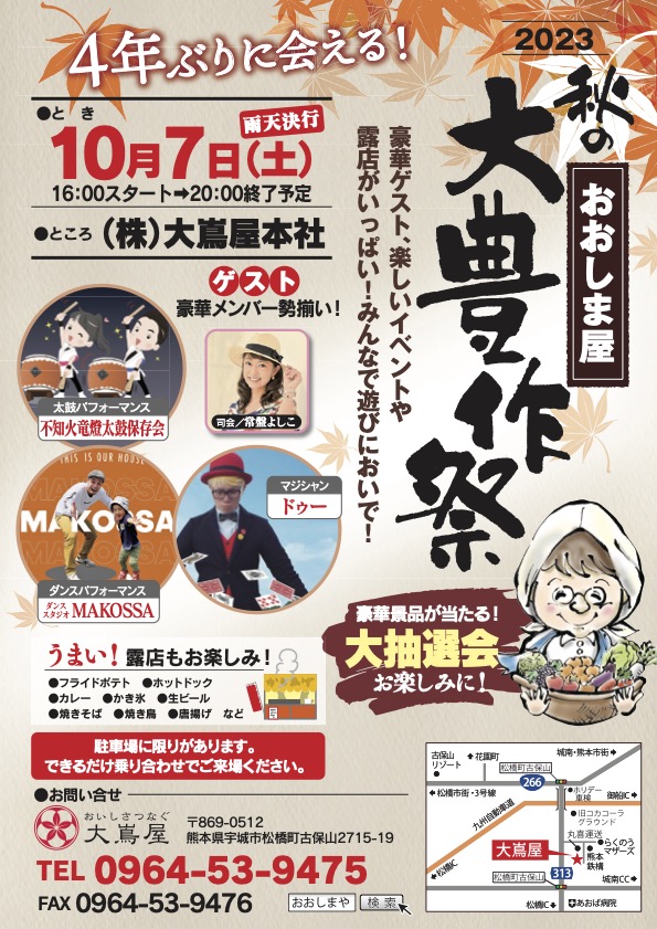 【2023年10月7日(土)16:00スタート】秋のおおしま屋大豊作祭開催!!